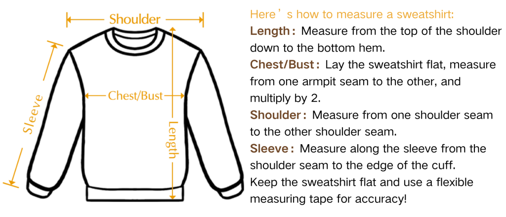 Size Chart How to use our Size Guide1. Lay down a sweatshirt or hoodie you currently wear or know fits you on a flat surface.2. Measure the width (chest) and length and compare it to our charts below. Remember, we are measuring the shirt, not your body. 【Hoodie】: 【Sweatshirt】: 1inch=2.54cmSizes can vary from 1-2 inches because they are measured by hand.